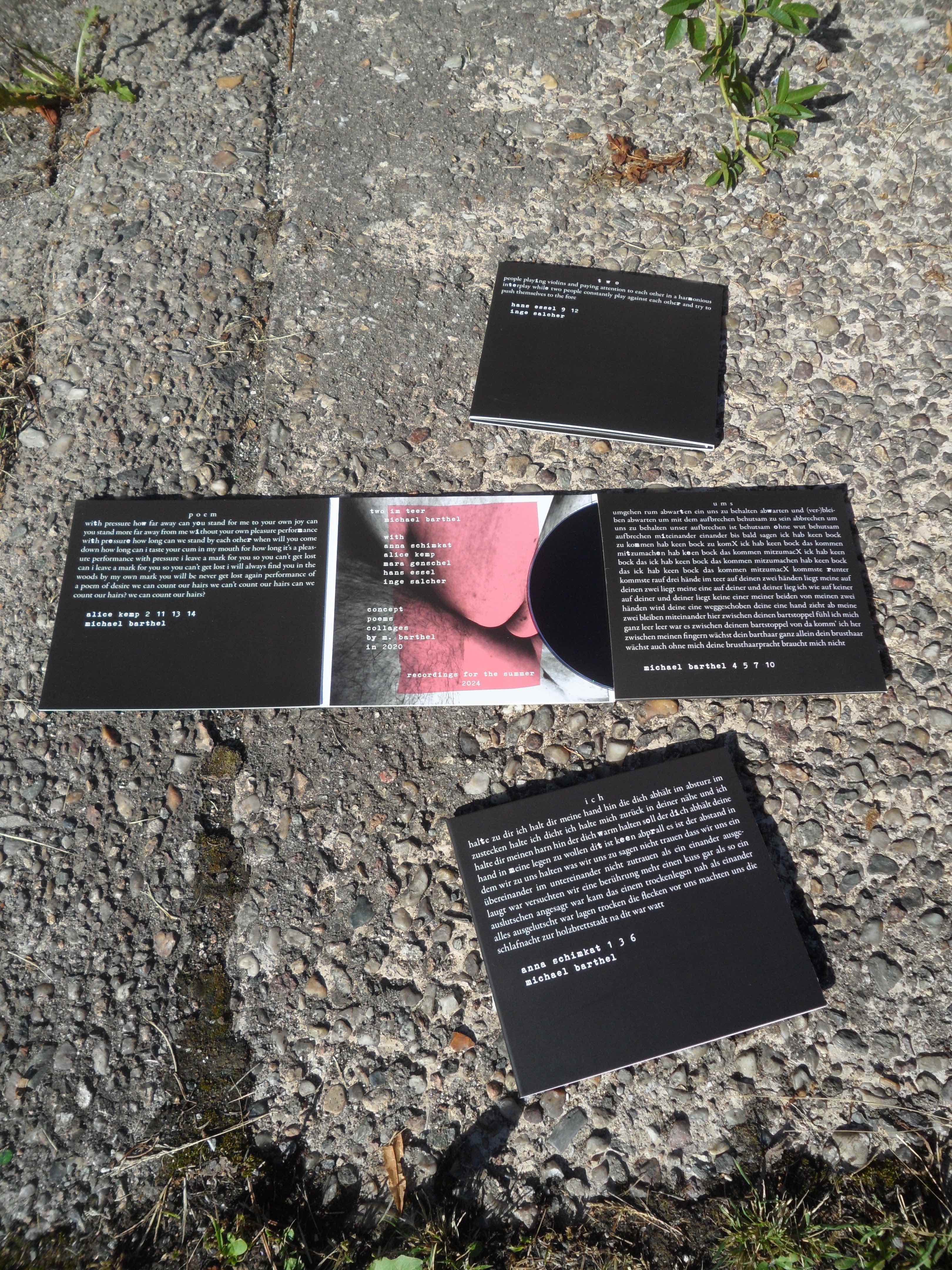 TWO IM TEER (two in the tar) contains five cycles of poems spread over fourteen tracks, always implemented differently in terms of sound. Poetry and sound poetry turn into fragile and lonely noises. An excessive collage of voices, piano, and increasingly distorted and destroyed tape recorders. Solo and in duet with the voices of ALICE KEMP, MARA GENSCHEL, ANNA SCHIMKAT, and the violins of HANS ESSEL and INGE SALCHER.